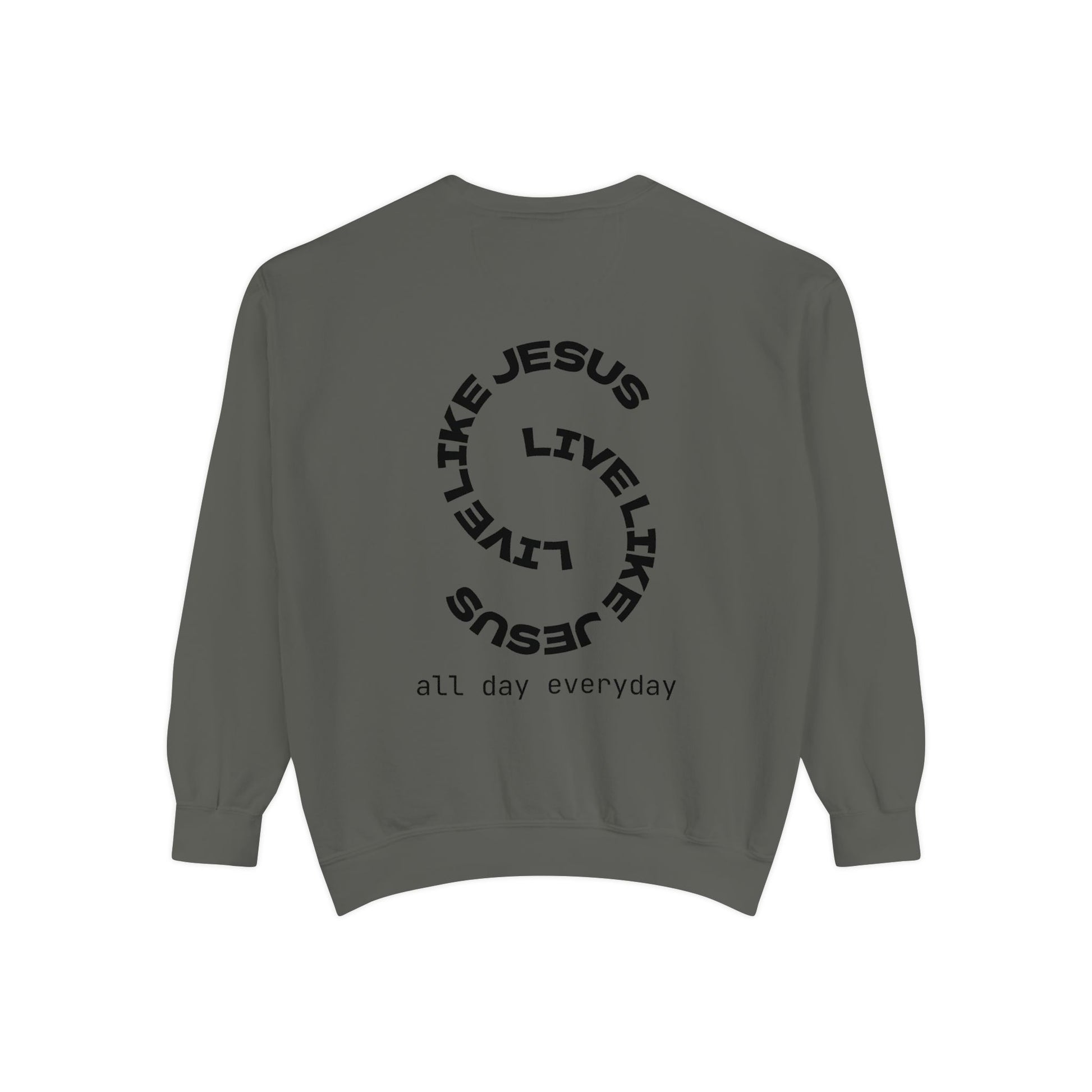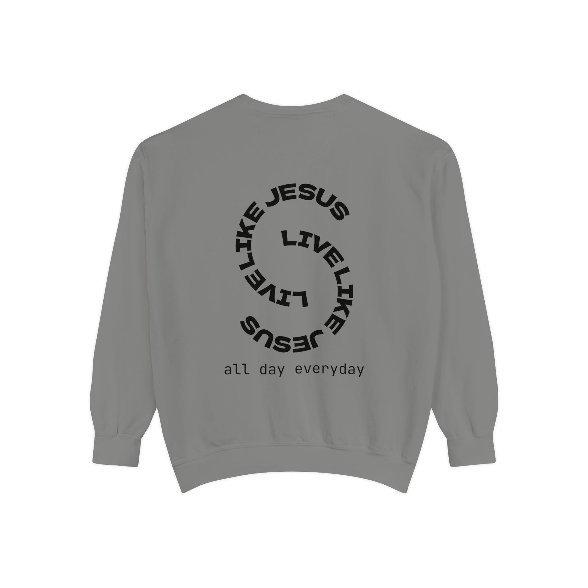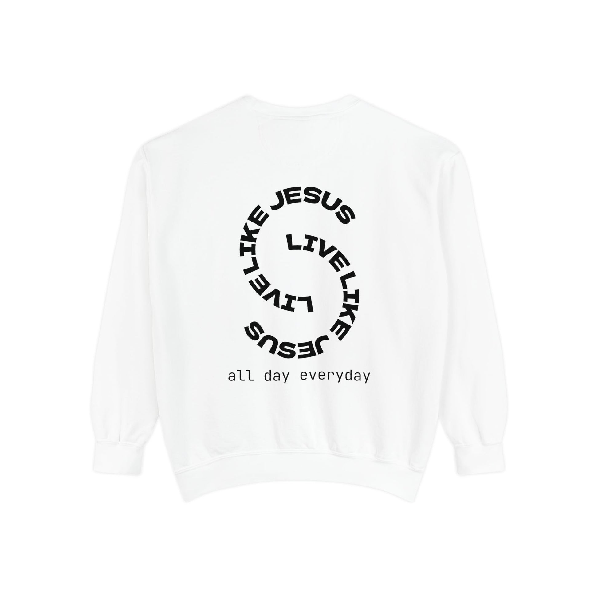 A Bold Call to Daily Discipleship. Faith isn't just for Sundays—it's for every moment. Our "Live Like Jesus" Christian mens sweatshirt about 'live like jesus, all day everyday' is designed for the man who wants his life to be a reflection of Christ’s love and strength. Featuring a unique, modern spiral graphic on the back that declares our mission to follow Him "all day everyday," this sweatshirt is a powerful testament to walking the narrow path with confidence.